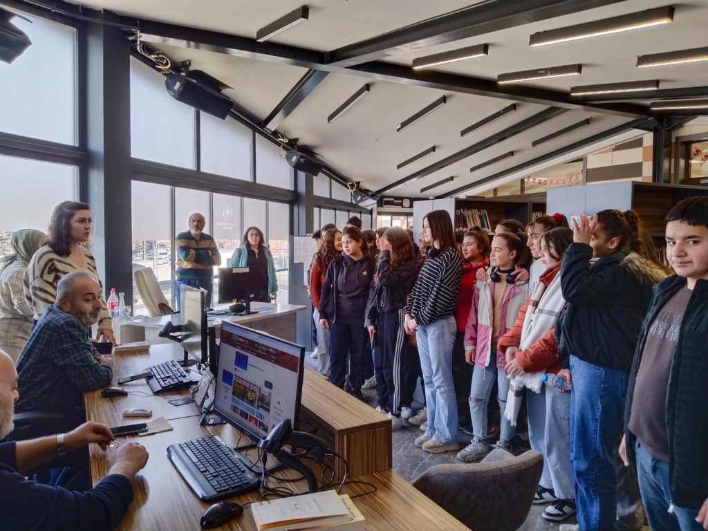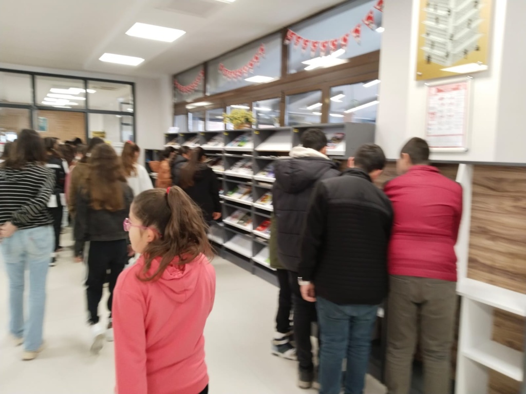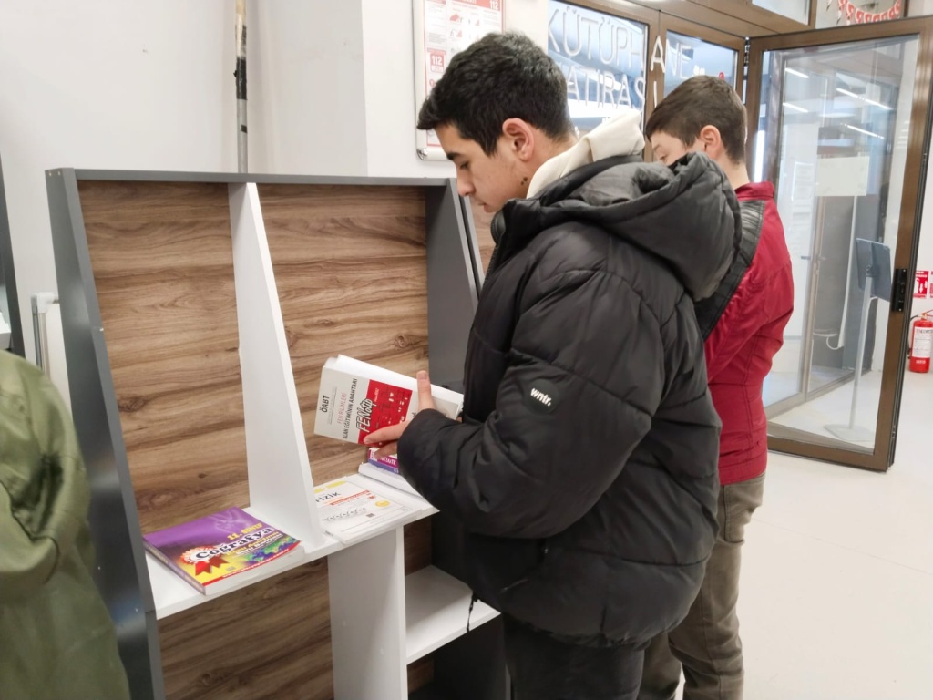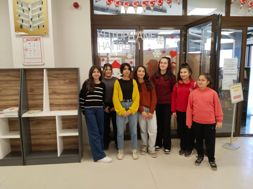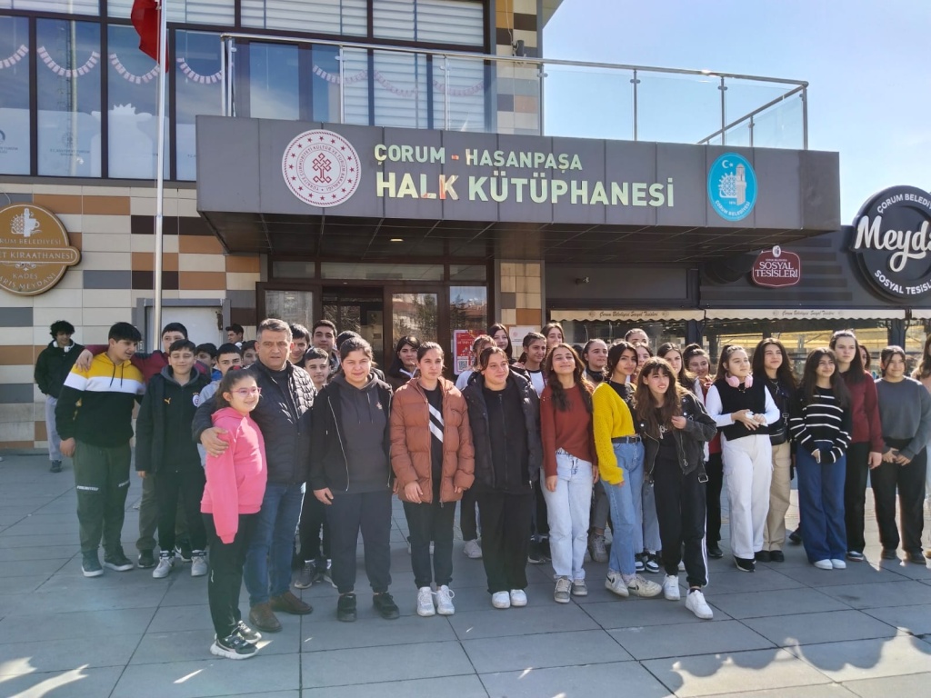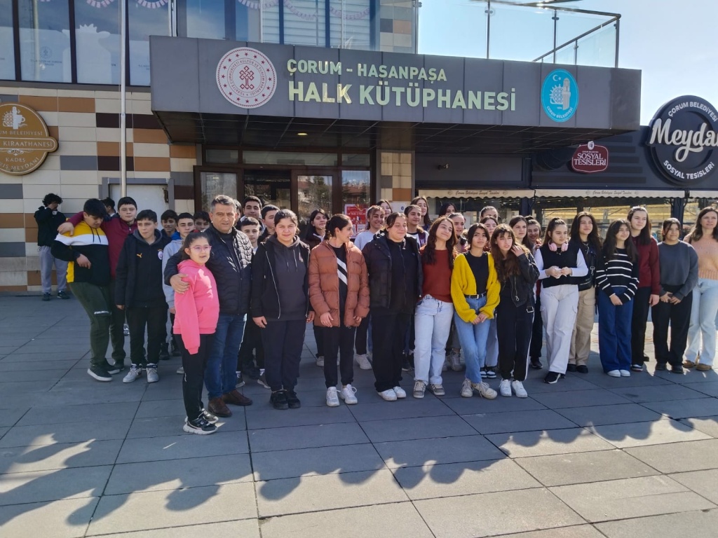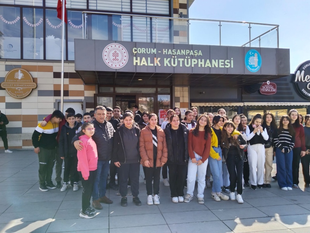 Milli Eğitim Bakanlığının başlattığı “Kütüphanelerdeyiz” etkinliği kapsamında ilimizde bulunan Çorum Hasanpaşa Halk Kütüphanesine 27.02.2025 tarihinde gezi düzenlendi. Geziye okul müdür yardımcılarımız Mehmet Ali Kaya ve Hüseyin Çimen, Türkçe Öğretmeni Emine Çimen, Beden Eğitimi Öğretmeni Mustafa Karayurt ve okul rehber öğretmenimiz Sezen Karataş ve ve 8.sınıf öğrencilerimiz katıldı. Öğrencilerimiz kütüphane hakkında görevliler tarafından bilgilendirildi.
